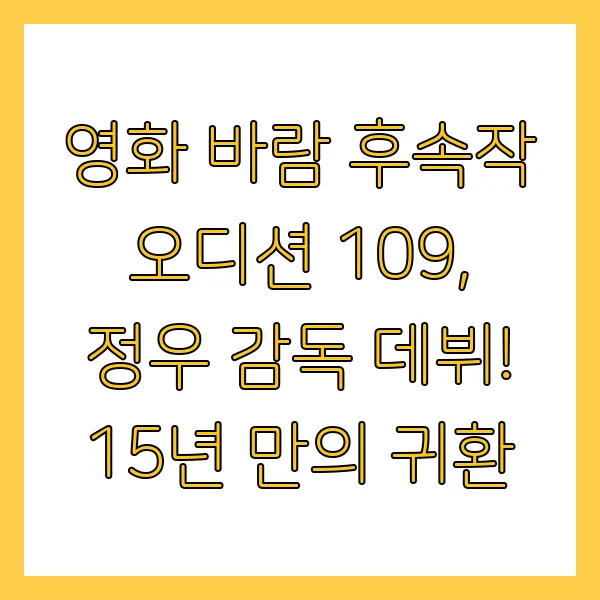 2009년, 10대들의 질풍노도를 생생하게 그려낸 영화 '바람'이 15년 만에 후속작 '오디션 109'로 돌아옵니다! 주연 배우 정우 의 감독 데뷔라는 놀라운 소식까지 더해져 팬들의 기대감이 폭발하고 있습니다. '바람'의 향수를 자극하는 요소와 정우의 새로운 도전, 그리고 '오디션 109'의 흥행 전망까지, 지금 바로 확인하세요!