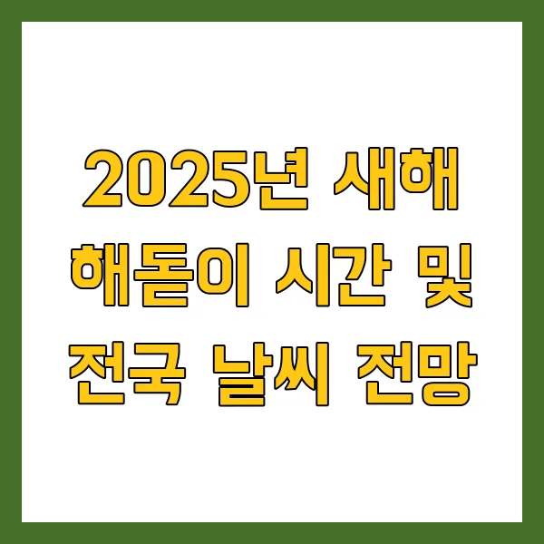새해 첫 해돋이, 놓칠 수 없죠?! 2025년 새해 해돋이 시간과 전국 날씨 전망을 자세히 알려드립니다! 주요 도시별 해돋이 시간은 물론, 날씨 변화, 추천 명소, 안전 수칙까지 꼼꼼하게 확인하고 소중한 추억을 만드세요! 해돋이 명소, 날씨 정보, 안전 수칙까지 모두 여기 있습니다!