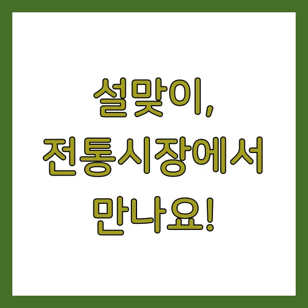 온 가족이 함께 전통시장을 방문하여 다양한 먹거리와 볼거리를 즐기고, 지역 상인들과 따뜻한 정을 나누는 소중한 시간을 가져보는 건 어떨까요? 전통시장은 단순히 물건을 사고파는 공간을 넘어, 우리 지역 공동체의 중심이자 따뜻한 정을 나누는 소통의 공간입니다. 설 명절, 전통시장에서 풍성한 혜택과 잊지 못할 추억을 만들어보세요! 지금 바로 가까운 전통시장으로 Go! Go!