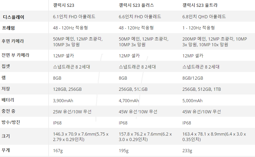 기본 모델(8GB, 256GB)이 119만 9000원, 플러스 모델(8GB, 256GB)은 139만 7000원 울트라 모델(12GB 램, 256GB)은 159만 9400원으로 책정되었습니다. 전작 갤럭시 S22 금액 대비 15만 원 정도 오른 금액입니다.